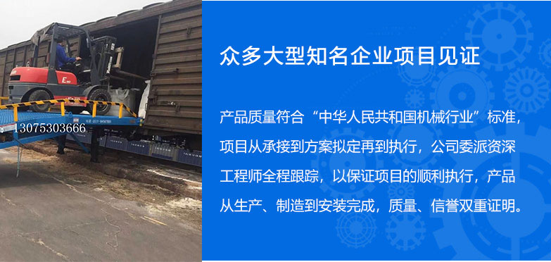 >> 13年的登車橋設(shè)備制造經(jīng)驗(yàn) 集設(shè)計(jì)、研發(fā)、生產(chǎn)和銷售于一體的制造型企業(yè),專業(yè)制造液壓登車橋,移動(dòng)式登 車橋和高空作業(yè)平臺,經(jīng)驗(yàn)豐富,擁有強(qiáng)大的成產(chǎn)技術(shù)和完善的管理模式。 >> 引進(jìn)國際先進(jìn)施工工藝 配備整套專業(yè)自動(dòng)化生成設(shè)備,引進(jìn)國外先進(jìn)技術(shù), 定期培訓(xùn),確保設(shè)備的高品質(zhì)。 產(chǎn)品具有設(shè)計(jì)新穎、結(jié)構(gòu)合理、升降平穩(wěn)、載重安全、操作簡單、維護(hù)方便等優(yōu)點(diǎn)。